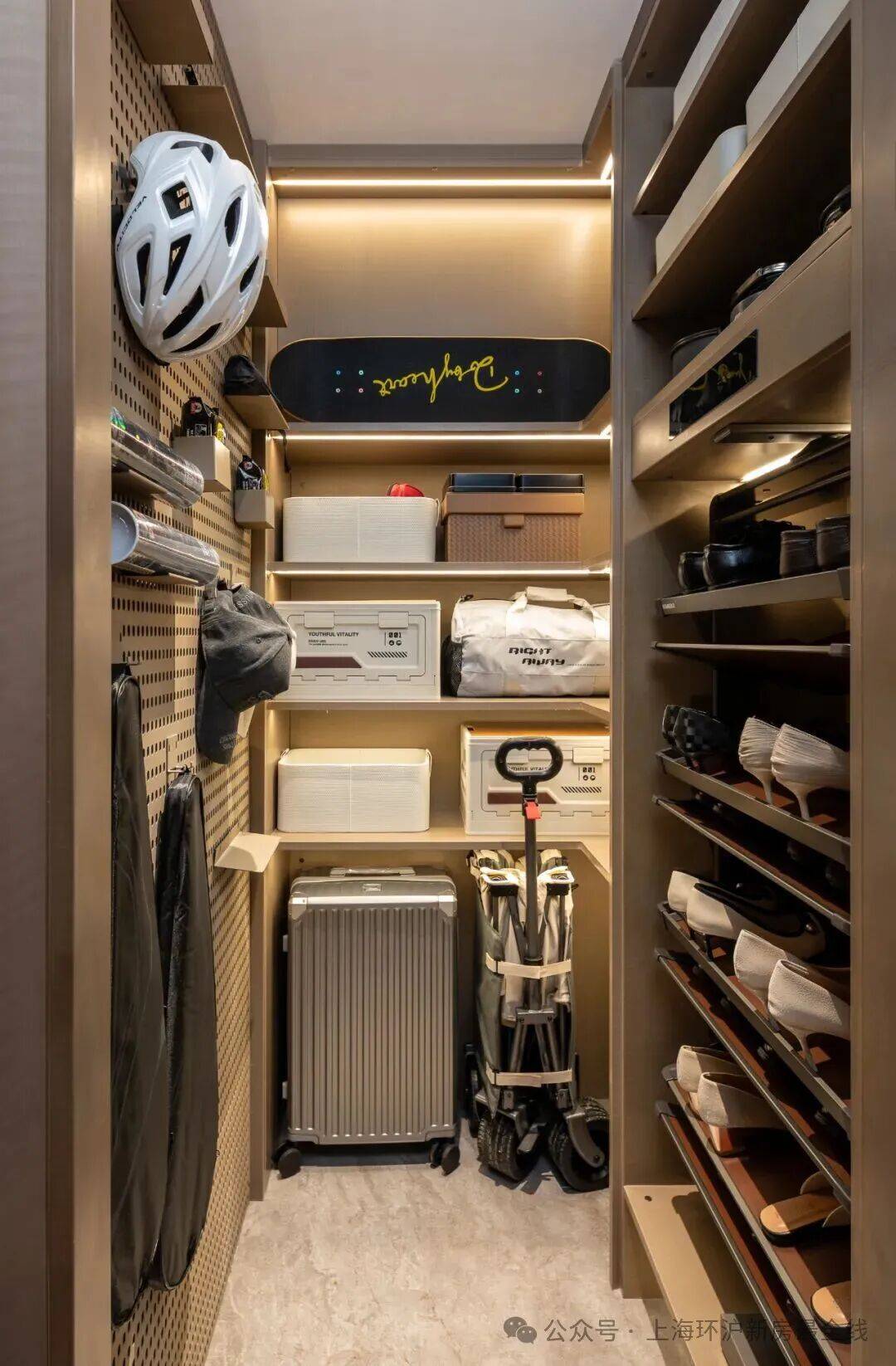 例如进门玄关采用储物间暗门+墙面烤漆板智能面板一体化设计,单独设置了一个“八百库”收纳间,实现杂物全部隐身!内部设置洞洞板墙、不同高度层板,增加收纳丰富性,还预留行李箱/自行车/儿童玩具空间,细节考虑满分~