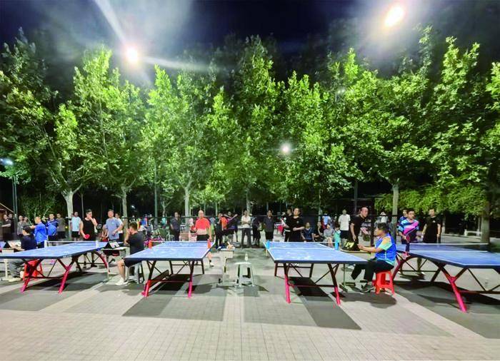 2019年,公园完成首轮环境整治,保留东侧运动区并新增健康步道、儿童游乐区,让受众群体进一步扩展,但场地专业性不足、空间容量有限的问题仍未解决。“群众的需求就是改造的方向。”公园管理单位负责人介绍说。2022年5月,乒乓球场地专项升级行动启动。如今的球场早已焕然一新:8张专业球台整齐排列,加厚台面保证弹跳均匀;高围网隔绝干扰,休息座椅方便球友轮换;智慧路灯系统让夜晚照明无死角,彻底解决了市民“天黑看不清球”的困扰。