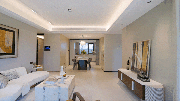 四开间朝南的方正格局如画卷展开,南向面宽将阳光编织成流动的绸缎,晨光在定制皮革硬包电视墙上跃动,金属条勾勒的几何线条与墙布的温润质感相映成趣!