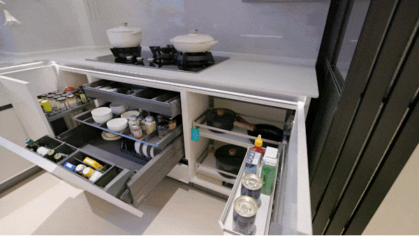 所有展示橱柜皆为交付标准,包括上柜、下柜、拉篮、随心抽,以及特别定制的飘窗水槽与水槽柜——每一处细节,都为真实的生活而考虑!