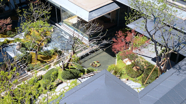 沿风雨连廊漫步,耳畔是流水淙淙,眼前是叠石苍松!约460㎡下沉庭院不像景观,更像一幅您就在其中的立体宋画,一草一木,都可触摸、可对话!